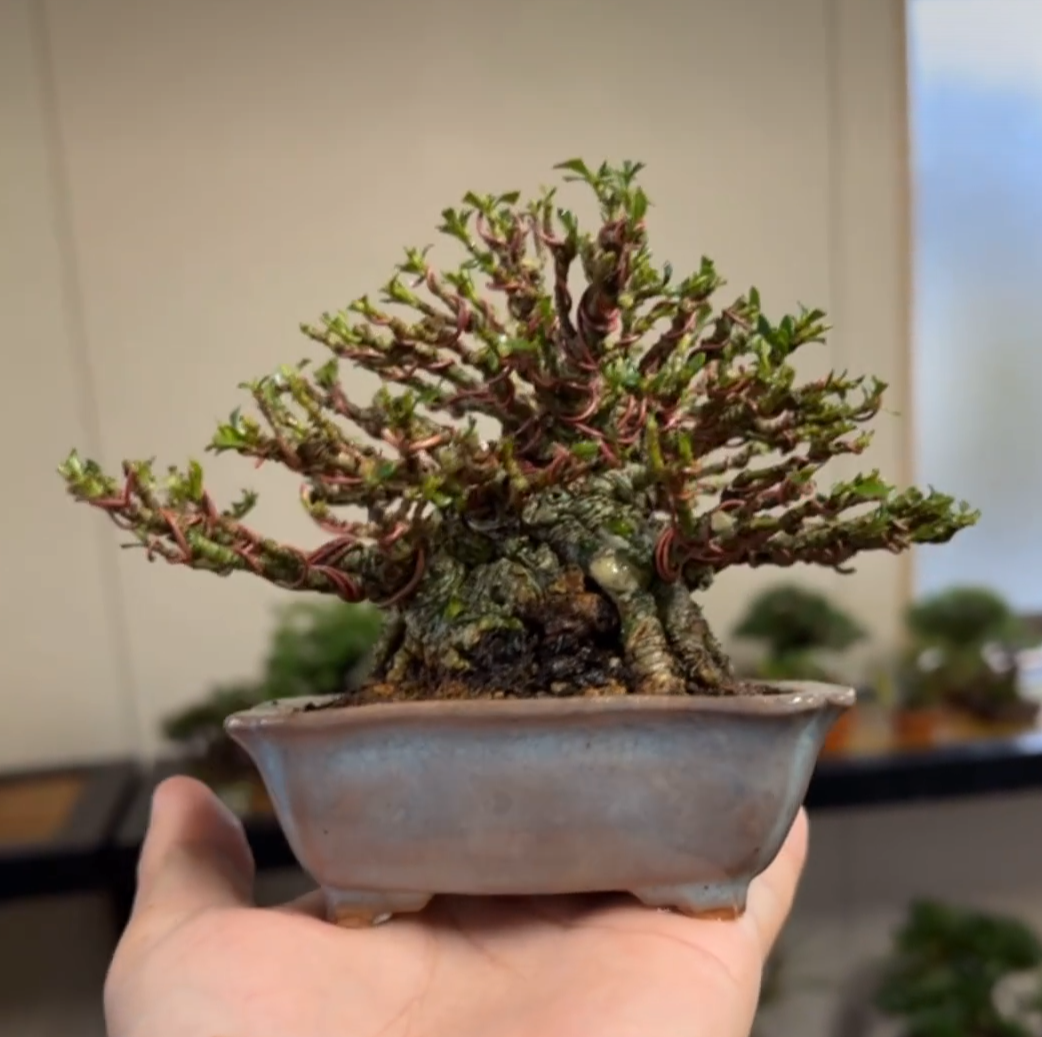 Bueno. Me decidí y lo convertí en lo que siempre quise que sea: un Shohin. Lo corte re corto, incluso con ramas sin hojas (recuerdo que el [[Arrayan#2022-04-17]] corté una rama gruesa y salieron muchos brotes de ella). También saque el auto injerto de rama. Está unido... Pero todavía no corté la rama original. Voy a dejar que se reponga un poco y lo hago.