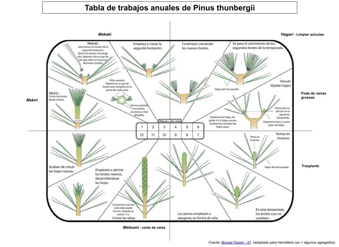 Hagari: se hace en otoño y consiste en sacar las acículas viejas. How to prune and decandle